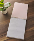 A beautiful crescent wreath with pink flowers and soft fuzzy catkins emerges on the front cover of the sage green hardcover notepad. The crescent wreath surrounds the gold-foiled sentiment that is presented in an elegant hand-lettered font.