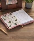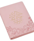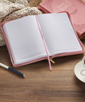 A three-leaf branch is heat-debossed on the back cover. The soft flexcover journal has a pink zipper with a gold metal zipper pull to ensure all your notes and reflections are safely stored inside. With 366 lined pages, each graced with an additional Bible verse printed at the bottom, you have more than enough space to capture your thoughts. A satin ribbon marker helps you quickly locate your spot, and a presentation page makes this an easy gift for a loved one.