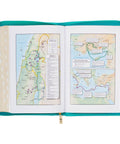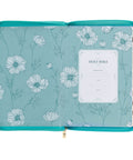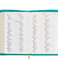 The design features of this Bible include a teal zipper with a gold metal zipper pull, ensuring the security of loose notes. The zipper pull is engraved with a cross design. Thumb indexing tabs make navigating the Bible effortless, while gilt-edged pages add an extra touch of shimmer to the overall design. Completing the ensemble is a matching teal satin ribbon page marker that provides a convenient way to keep your place. A presentation page in the front of the Bible lets you add a meaningful message to mark a special occasion.