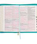 The Vibrant Teal Faux Leather Large Print Thinline King James Version Bible with Zippered Closure and Thumb Index is the perfect blend of style and convenience. This beautiful Bible offers the timeless beauty of the KJV text with the practicality of a Thinline format, thumb indexing, and a zippered closure.