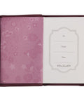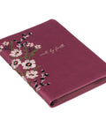 The classic journal's rich beet red cover is decorated with an embroidered pink blossom design that flows across the spine. The sentiment is presented in an informal rose gold-foiled script on the front cover.