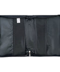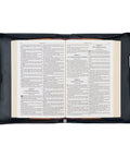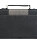 The panels wrap around the spine, where a sturdy lay-flat handle is attached with silver handle hardware, and disappear behind a black slip pocket on the back panel of the cover. The slip pocket is edged in gray topstitching. A silver metal zipper pull attached to a black zipper ensures the cover closes smoothly. Two pen loops are included inside the Bible case to store pens or highlighters.