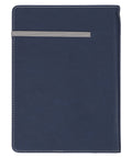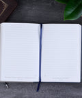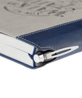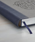 The journal is elegantly bound in navy blue faux leather that extends across the back, wraps smoothly around the spine, and meets a gray front panel with a double row of topstitching. The smooth gray panel is decorated with a heat-debossed typographical design, organized in an oval layout that prominently displays the sentiment in heat-debossed letters.