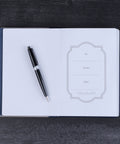 Silver gilt edging adds a subtle sheen to the design, while a gray elastic band, anchored on the back and front panels, wraps horizontally around the journal to keep it closed. A convenient pen compartment is integrated into the extended spine, ensuring your writing tool is always at hand. Lastly, a satin ribbon marker is included to help you quickly find your page and stay organized with your journaling.