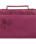A slip pocket on the back cover is decorated with a single heat-debossed rose and is useful for storing loose notes or bulletins. Gold-toned metal handle hardware matches the cross-engraved zipper pull and adds to the richness of the design. The handle folds completely flat when the cover is opened so that you can read the entire page. Two pen loops are included on the inside of the case to keep a pen and a highlighter handy.