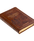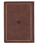 Read the beloved Walking With God Devotional in large print when you pick up a copy of the Walking With God Large Print Saddle Tan Faux Leather Devotional. David Jeremiah is a New York Times bestselling author who pairs down the Word of God into 365 beautifully crafted devotional readings that will help guide your walk of faith. The saddle tan faux leather front cover of the Walking With God Large Print Devotional is heat debossed with a beautiful nature scene that includes a majestic mountain peak in the background and a pine tree forest in the foreground. The scene is framed by a gold foiled border with a heat-debossed shadow frame. The title is gold foiled on the front cover and spine and accented with heat-debossed scroll elements.