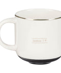 The white ceramic mug has a sophisticated design with a crisp white body and a black base. A metallic silver rim around the mouth opening corresponds beautifully with the foiled letters.