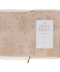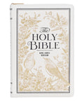 The birds and botany design of the White and Gold Faux Leather Large Print Thinline King James Version Bible with Zippered Closure and Thumb Index paired with its luxury zipper closure and thumb index makes this the perfect gift for an elegant mother or aunt.