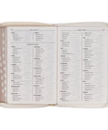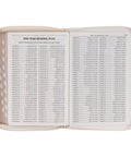 This Bible's design features include a white zipper with a gold metal zipper pull, ensuring the security of loose notes. The zipper pull is engraved with a cross design. Thumb indexing tabs make navigating the Bible effortless, while gilt-edged pages add an extra touch of shimmer to the overall design. Completing the ensemble is a matching white satin ribbon page marker that provides a convenient way to keep your place. A presentation page in the front of the Bible lets you add a meaningful message to mark a special occasion. This Bible's comfortable weight and large size make it perfect for holding in church.