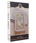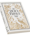 An exquisite gold-foiled floral design with two perched gold-foiled birds adorns the thinline Bible's white faux leather front cover. A black double frame surrounds the scene and coordinates with the black-lettered title in the middle of the design, creating a striking yet beautifully synthesized layout.