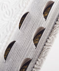 The cover of the Deluxe Gift Bible is divided into two panels. The bottom panel features a continuous heat-debossed floral quatrefoil design, while the smooth top panel holds the silver-foiled title and version reference.