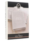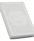 The pure white front and back covers of the faux leather KJV Bible feature a subtly heat-debossed leafy creeping vine design anchored by a heat-debossed and silver-foiled frame. The front cover features the title in silver foil and the heat-debossed version reference.
