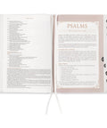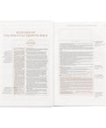 Luxury features of this Bible include a presentation page, gilt-edged pages, ribbon markers, a thumb index, and an index of authors and articles featured in the back. The presentation page in the front can be personalized and states the premise for the design of this beautiful Bible.