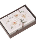 The cards are left blank inside to allow you to add your own message. The set includes 20 cards paired with coordinating lavender envelopes. It comes packaged in a sturdy taupe-colored box adorned with a subtle tone-on-tone magnolia pattern. The box has a clear acetate lid to give a glimpse of the cards inside.