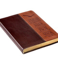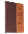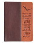 The two-tone brown LuxLeather journal holds 400 lined pages and a ribbon marker for keeping your spot. The front cover shows a light brown strip with a debossed eagle and text from Isaiah 40:31, “But those who hope in the Lord will renew their strength. They will soar on wings like eagles; they will run and not grow weary, they will walk and not be faint.”