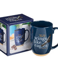 The Wings Like Eagles Navy Blue Ceramic Coffee Mug conveys the message of the unshakeable confidence that empowers us when we hope in the LORD.A bold soaring eagle is laid out in white and black on the front of this ceramic coffee mug. Gold foil accents to indicate light glinting off of its wings are added to the design. The flying eagle overlaps the gold foiled and white lettering that spells out the sentiment.