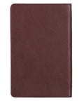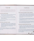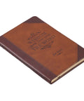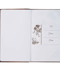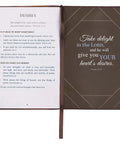 A brown faux leather panel starts on the back of the gift book, wraps around the spine and meets a toffee brown front panel styled in a traditional half-bound style with brown faux leather corners. The pages are gilt-edged and the interior is printed in two colors: brown and blue. A brown ribbon marker is included to mark your page and full-color Scripture verses are set at intervals throughout the book.