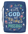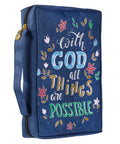 The durable fabric used to construct the navy Bible cover is waterproof and screen printed with a full-color floral design. The flowers in the design are strewn around the playfully arranged title with its colorful lettering outlined in white. The title is taken from Matthew 19:26.