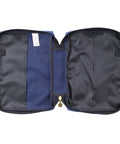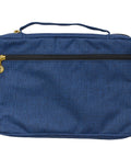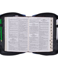 The Bible cover opens completely flat thanks to a lay-flat spine handle constructed from the same durable fabric. A black zipper with a cross-engraved brushed gold zipper pull closes tightly to keep valuables inside. An exterior zip pocket with a cross-engraved zipper pull is added to the back panel to store loose papers and even Kleenex. Two pen loops and two slip pockets to hold the outer covers of the Bible can be found inside.