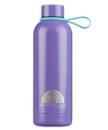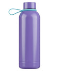 The stainless steel water bottle has a smooth purple exterior. At the base of the bottle, you will find a laser-engraved rainbow design with a laser-engraved sentiment.