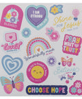 The water bottle has a green finger loop that is attached to the base of the mouth opening and a twist-off cap with a silicone seal. It is double-wall insulated to keep contents at a steady temperature for up to 24 hours. It holds 17 fluid ounces - perfect for young hands. The water bottle comes with a sticker sheet that contains 15 plus stickers. The stickers feature shapes and designs that include biblical sentiments.