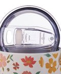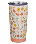 The stainless steel tumbler's pale peach background is dotted with cutesy florals in muted shades of pink, yellow, and orange. The flowers create an opening on the front where the sentiment is displayed in gray letters accented with silver foil.