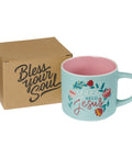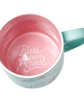 The Y'all Need Jesus mug exterior is colored a light aqua. A wreath filled with colorful flowers encircles the sentiment that is presented in colors to match the flowers. The mug's interior is shaded a happy light pink to continue the pastel color scheme. And, when you take your last sip, you'll see the cheery Bless Your Soul imprint hidden on the cup's bottom!