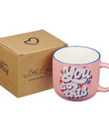 The mug's glossy candyfloss pink exterior is emblazoned with the white-lettered sentiment outlined in blue. Hearts, stars, diamonds, strawberries, and lightning bolts jazz up the composition.
